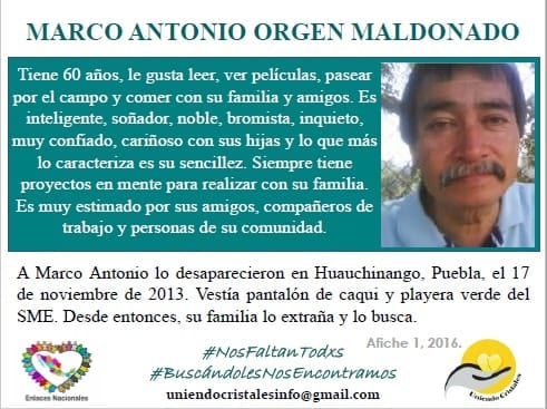Fue visto por última vez al salir de su domicilio en Huauchinango, Puebla, el día 8 de mayo de 2020 con la edad de 36 años. Se desconoce su paradero.